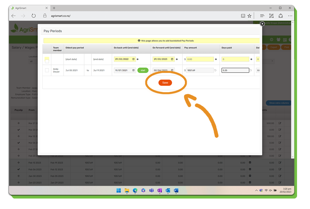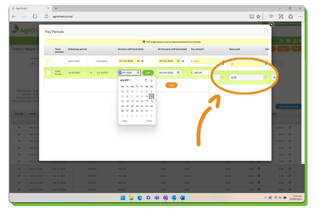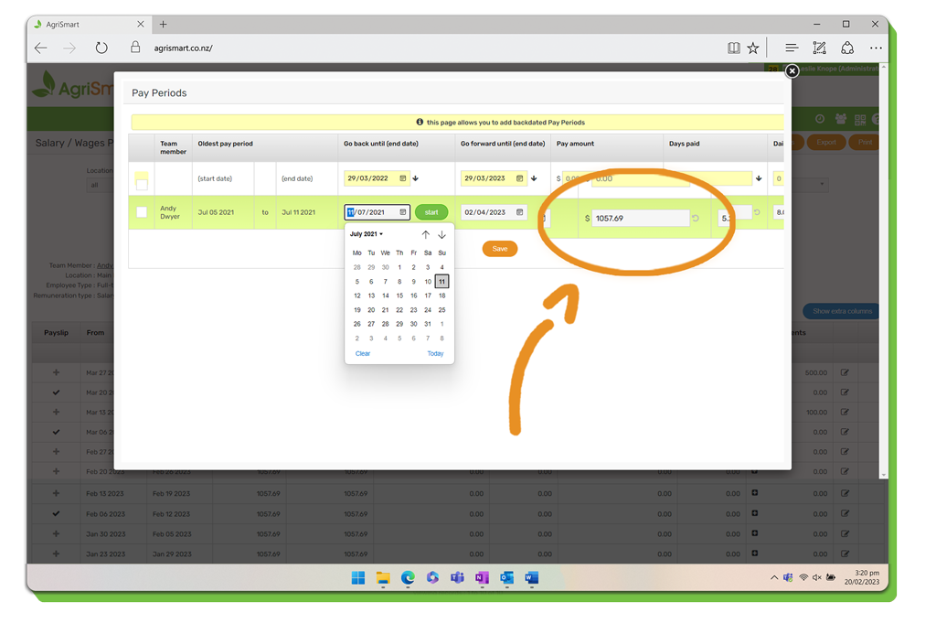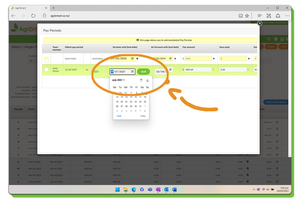 5. The following screen will appear, select the date that you want the pay periods to go back to: